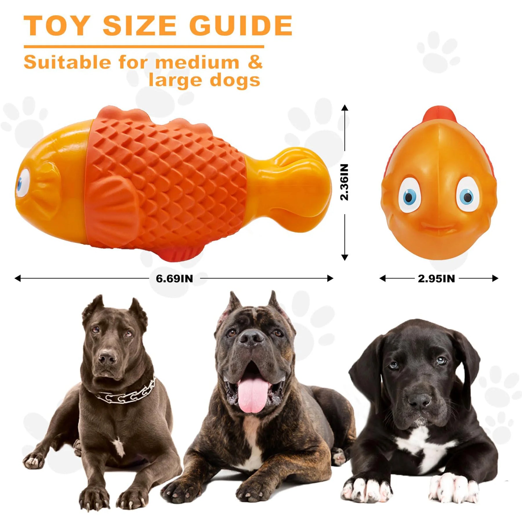 MateeyLife - 100% HONEST WITH CUSTOMERS The eyes of our dog chew toy are designed to make the product more cute and realistic, so as to attract dogs. However, after the dog's saliva soaked and chewed for a long time, the coating of the eye may appear to be off the paint, but it is completely non-toxic and safe. If you still care, take a knife and scrape off the eye coating before giving the toy to your dog. In order to make the durable dog toy more durable, the material at both ends of the head and tail is made of hard nylon, so the toy will be heavier than the ordinary pure rubber dog toy, so here we remind customers: please be careful of your toes or the floor is hit by the toy. Nylon is tough enough for a dog to chew for a long time, but time leaves its mark. The nylon heads and tails of toys will also one day become frayed or even slightly sharp. If you notice how rough and sharp the ends became, being afraid it would cut the dog's gums, we suggest you can use a wood file or very gritty sandpaper to smooth out the ends of these super chewer dog toys for your dogs to play with for longer. The reason why our tough dog toys are suitable for large, small and medium-sized dogs is because of our careful design. The head and body size of the toy is only big enough for medium and big dogs to bite because their mouths are big enough. For small dogs, such as dogs with small mouths or small strength, the toy's tail and fins protruding from the side of the body are specially designed for them, and we have designed the size to be smaller and easier to bite. (So before you place orders, please note that large and medium dogs may easily destroy these designs for small dogs.) PROPER SUPERVISION Teach your dog how this sturdy dog toys for aggressive chewers works. Proper supervision is recommended to ensure your dog's health and safety. Regularly check the wear and tear of indestructible dog toys for big dogs to ensure there are no broken or fractured parts to prevent your dog from swallowing or choking. MateeyLife tough dog toys aggressive chewers weighs 0.62 lbs. Please monitor if your dog likes to throw nylon dog bones, in case it breaks the floor or furniture.
